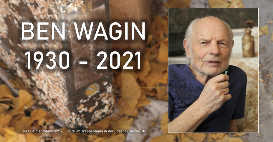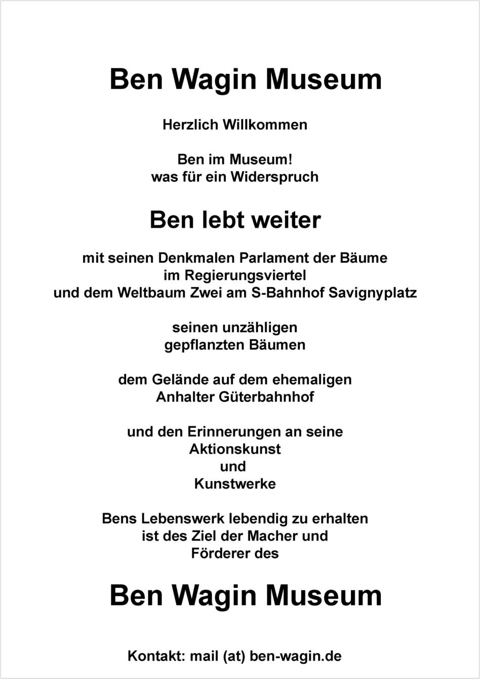 Zu seinen herausragenden Arbeiten gehört der im November 1986fertig- und 2022 unter Denkmalschutz gestellte Weltbaum II an derBrandmauer des S-Bahnhofs Savignyplatz. Ausgestellt werden die Arbeiten der ersten Ausfertigung. Ergänzt wird das Ganze mit Kurzfilmen über Ben Wagin und den S-BahnhofSavignyplatz.Den Ausstellungsraum finden Sie in der Möckernstraße 26,schräg gegenüber vom Spectrum des Deutschen Technikmuseums, Bitte beachten Sie beim Besuch die Haftungbeschränkung.Leider ist der Zugang nicht barrierefrei.Geöffnet immer Sonntags von 13-17 Uhr und nach Vereinbarung.Rufen Sie mich an unter der Tel.: 0171 521 40 24oder schreiben eine Email: mail (at) Ben-wagin.deDer Eintritt ist frei.