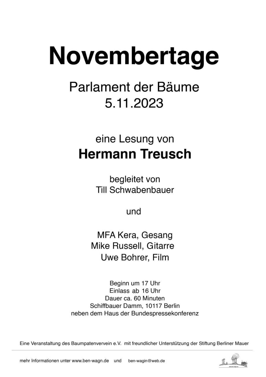 Am Sonntag, dem 5.11.2023 um 17 Uhr findet im Parlament der Bäume eine Veranstaltung zu Ehren und in Erinnerung an Ben Wagin statt.„Novembertage“ nennt Hermann Treusch seine Lesung, in der nicht nur umden 9. November geht. Musikalisch unterstützt wird er wie immer vonTill Schwabenbauer mit seiner Klarinette. In den Mülltonnen auf der Mauerkrone,seinerzeit genutzt für die Losung der Grenzhunde, finden sich Losungenganz anderer Art. Und Hermann Treusch hat noch mehr im Gepäck.MFA Kera, Gesang und Mike Russell, Guitarre, geben dem Ganzen denmuskalischen Rahmen und Uwe Bohrer zeigt Ausschnitte aus seinemFilmprojekt über Ben Wagin. Beendet wird die Veranstaltung mit demKurzfilm Todesstreifen von Michael Brynntrup.Beginn ist 17 Uhr, Einlass ab 16 UhrDauer ca. 60 Minutender Eintritt ist frei