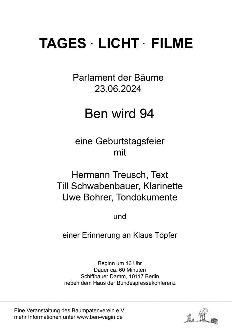 Liebe Freunde, Bekannte von Ben und alle, die Ben kennen lernen wollen,94 Jahre alt wäre Ben geworden. Am 23.6., also am Sonntag,im Parlament der Bäume, feiern, erinnern und ehren Hermann Treusch, Till Schwabenbauer und Uwe Bohrermit einem akustischen Programm das Geburtstagskind.Hermann Treusch, Schauspieler, Regisseur und Theaterintendant, rägt Texte vor, auch Texte aus eigener Feder.Till Schwabenbauer, Dirigent, Musiker und Musikwissenschaftler begleitet ihn mit seiner Klarinette.Uwe Bohrer, Kameramann und Filmemacher bringt aus seinem ArchivTondokumente zu Gehör, Stimm- und Wortgewaltiges von Ben.Die Töne stammen aus dem Material für einen Dokumentarfilmüber und mit Ben.Die Filme selbst werden auf eine Leinwand projiziert. Wegen des Tageslichts bleibt von den Bildern nur ein blasser Eindruck.Daher auch der Titel der Veranstaltung:TAGES – LICHT – FILMEEine Freund von Ben und wichtiger Förderer des Parlament der Bäumeist im Juni verstoben, Klaus Töpfer.Ihm zu Ehren wird mit einem Tondokument gedankt.Dauer: ca. 60 MinutenOrt ist dasParlament der Bäumeam Schiffbauer Damm neben der BundespressekonferenzBeginn:16 UhrDer Eintritt ist frei.Eine Veranstaltung des Baumpatenverein e.V.Das Parlament ist am Sonntag von 12-17 Uhr für Besucher geöffnet.